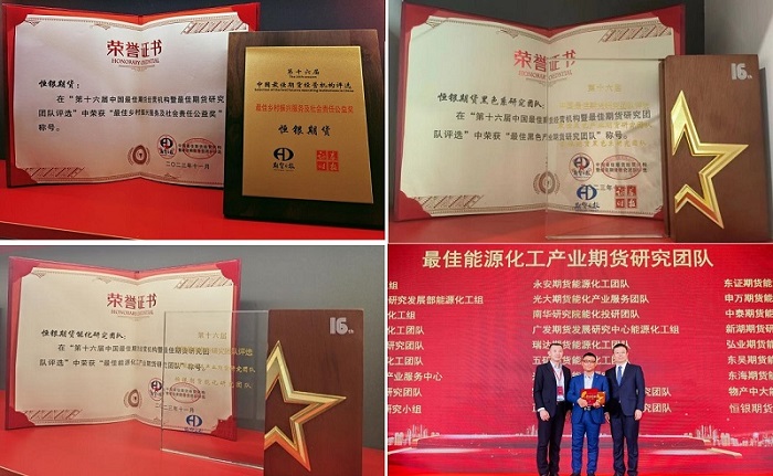 本屆評(píng)選于今年4月啟動(dòng),在歷時(shí)四個(gè)多月,經(jīng)過(guò)手機(jī)投票、專(zhuān)家評(píng)審等環(huán)節(jié),恒銀期貨最終榮獲“最佳能源化工產(chǎn)業(yè)期貨研究團(tuán)隊(duì)”、“最佳黑色產(chǎn)業(yè)期貨研究團(tuán)隊(duì)”以及“最佳鄉(xiāng)村振興服務(wù)及社會(huì)責(zé)任公益獎(jiǎng)”。