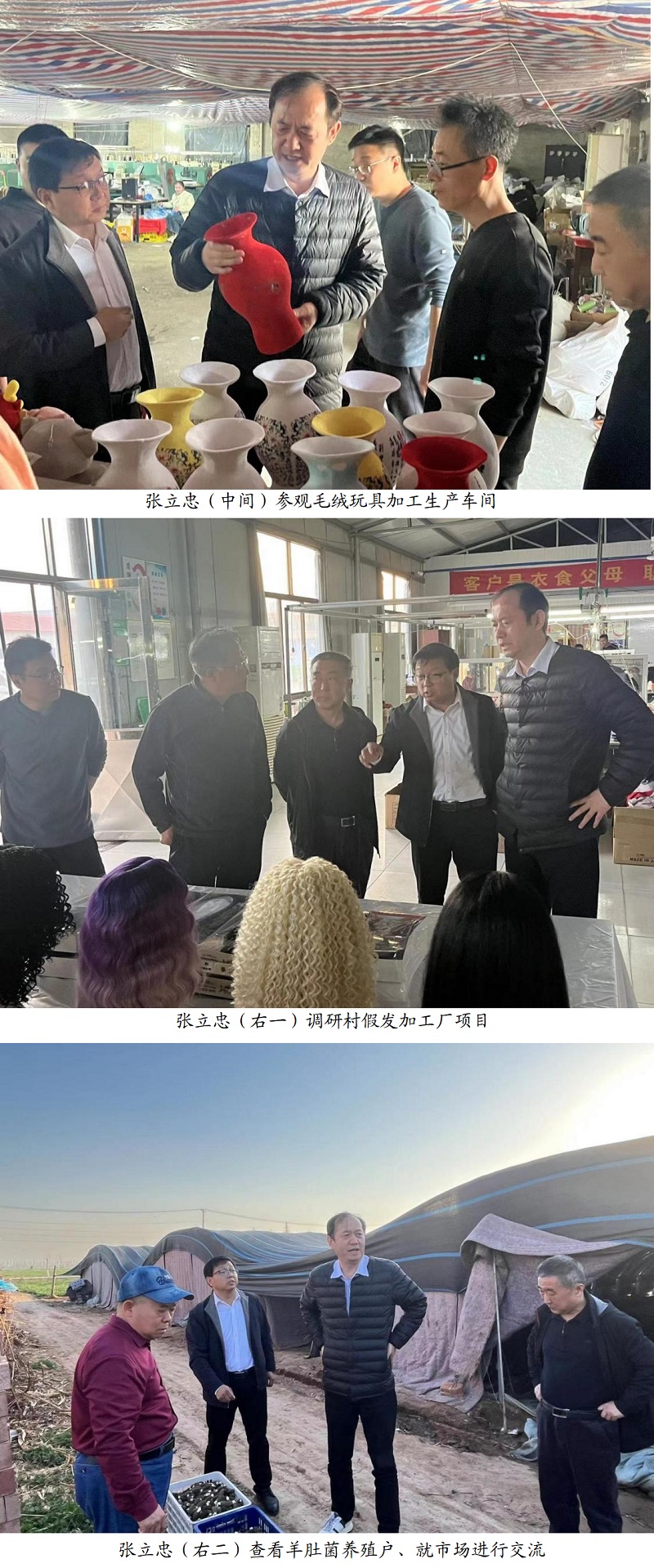 調(diào)研工作由曲周縣大河道鄉(xiāng)黨委書記王貴民陪同,參觀了毛絨玩具、假發(fā)加工車間和羊肚菌種植基地。會議中介紹了賈莊村當前發(fā)展狀況、存在問題以及未來發(fā)展規(guī)劃。下沉工作隊隊長齊連洪匯報了工作隊近期走訪調(diào)研及項目謀劃的工作進展和下一步工作打算。