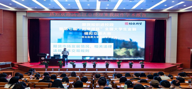 2024年6月5日,恒銀期貨總經(jīng)理湯志江率領(lǐng)團(tuán)隊(duì)在河北地質(zhì)大學(xué)華信學(xué)院報(bào)告廳開展了一場別開生面的“期貨知識進(jìn)校園”活動(dòng),并同步舉辦了第七屆“鄭商所杯”全國大學(xué)生金融模擬交易大賽——河北地質(zhì)大學(xué)華信學(xué)院專場宣講會(huì)。為了預(yù)熱本次活動(dòng),校方在公眾號發(fā)布了活動(dòng)通告,受到了各系學(xué)生的熱烈追捧,參會(huì)人數(shù)超過300人。此次活動(dòng)旨在加強(qiáng)期貨知識在校園的普及與推廣,提升大學(xué)生對金融市場的認(rèn)識與理解,同時(shí)也為廣大師生提供了“鄭商所杯”這樣一個(gè)展示才華、交流學(xué)習(xí)的平臺(tái)。