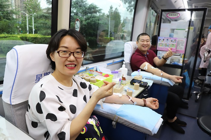 這些獻血員工當中,有的是多次參加無償獻血的老同志,也有剛參加工作不久的新員工,其中不乏巾幗不讓須眉的女同志。“這是我第一次獻血,在國慶節(jié)到來之際能奉獻自己的一份愛心,感覺很有意義?!眹煌顿Y集團黨群工作部經(jīng)理李杰自告奮勇第一個走上前。員工李帥早早地就過來排隊,這已經(jīng)是他第三次獻血了?!拔迥昵霸诓┪镳^廣場看到獻血車,就上去獻了第一次血,后來就停不下來了。”李帥告訴記者。