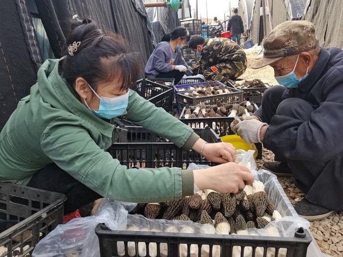 眼下正值羊肚菌豐產(chǎn)期,在北店頭鎮(zhèn)西同籠村的三十多個溫室大棚里,羊肚菌長勢喜人,村民們正在忙著收割、打包,一派忙碌景象。